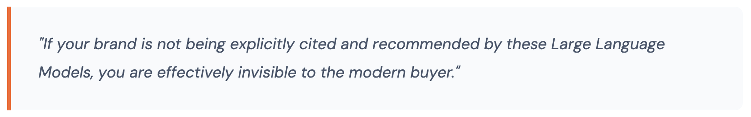 In the old SEO model, you won attention by ranking for keywords. In the new AI-driven model, you win consideration by being the brand the system trusts enough to recommend. Most companies are completely blind to this shift. They are still optimizing for ten blue links while their buyers are having dynamic, conversational interactions with AI engines.