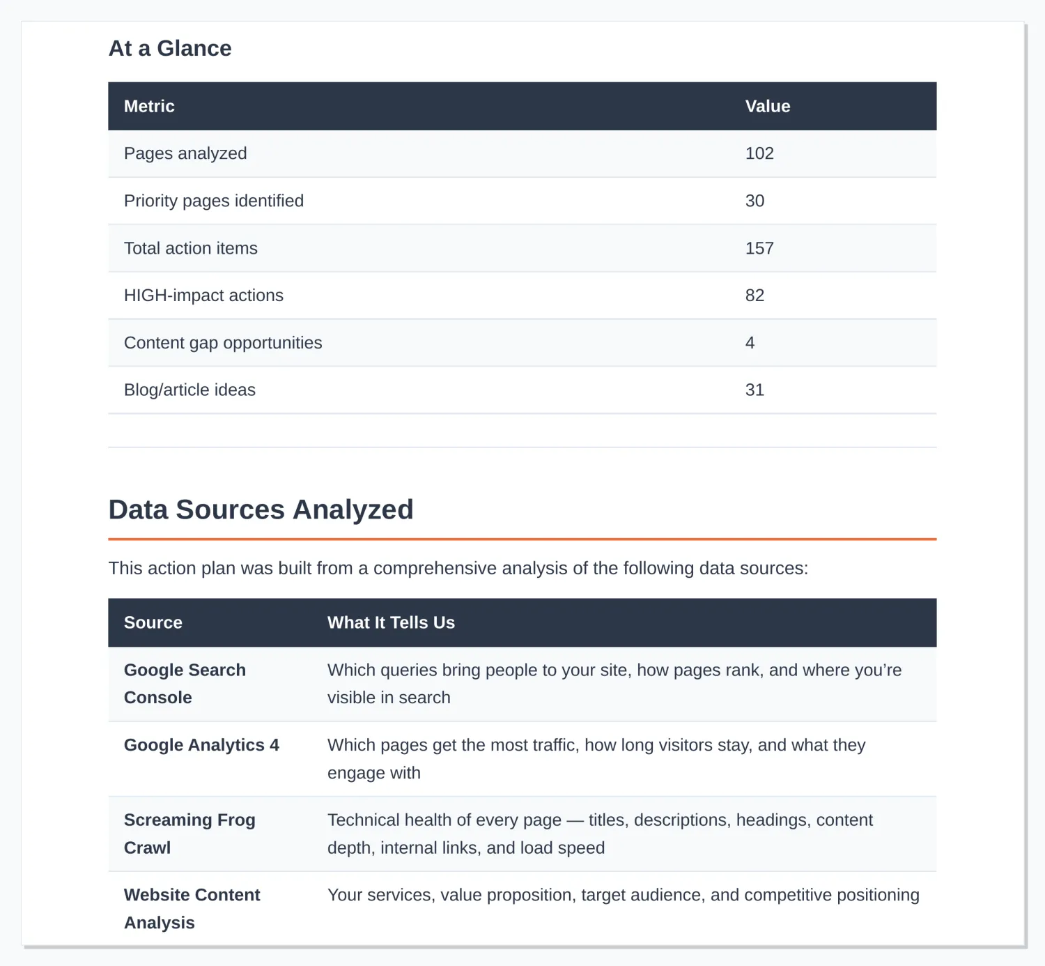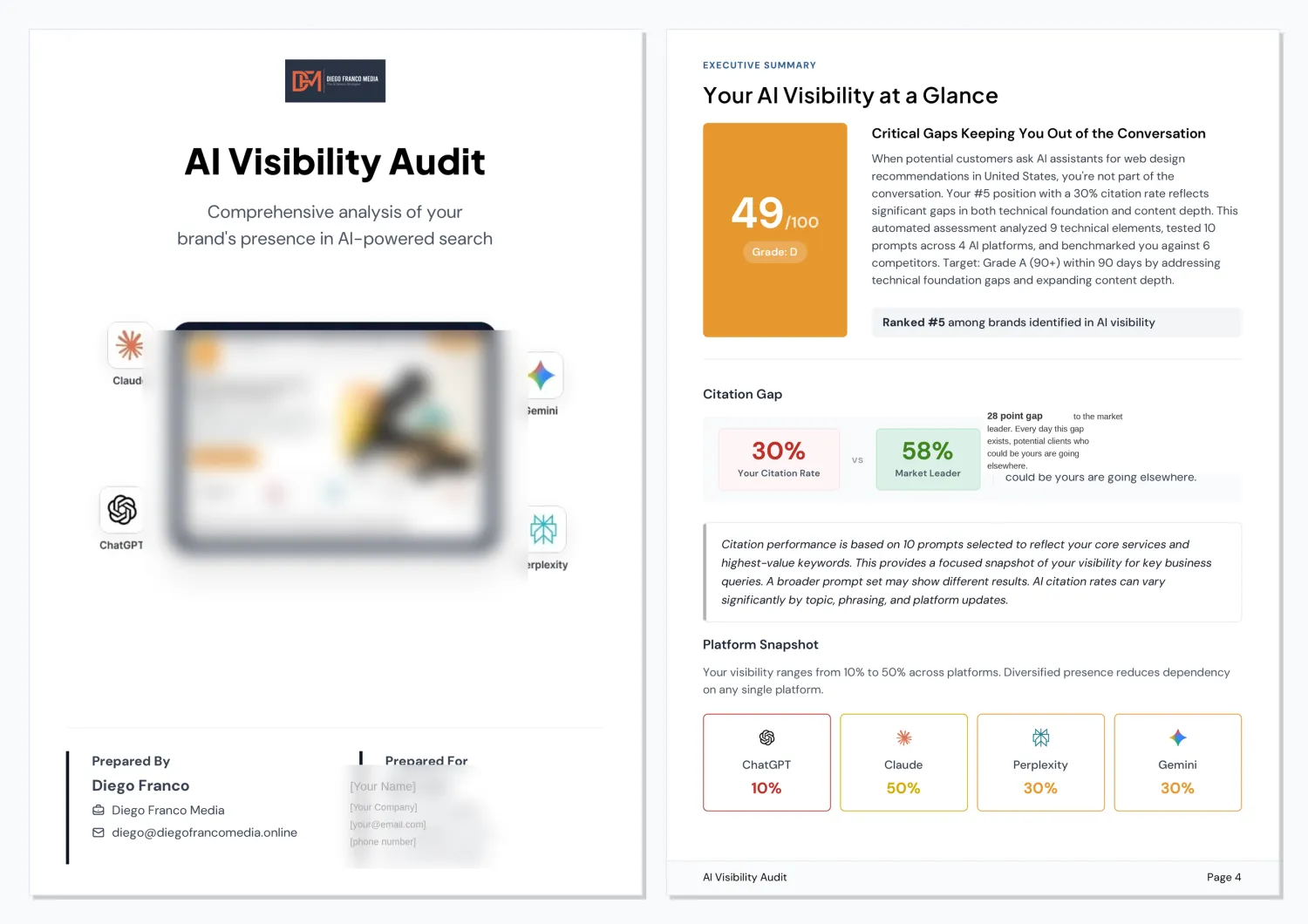 We can still deliver a powerful Blueprint. The AI visibility analysis, competitor benchmarking, and technical scorecard do not require GSC or GA4 access. However, if you do provide access, we can layer in real traffic data and keyword performance to make the recommendations even more targeted.